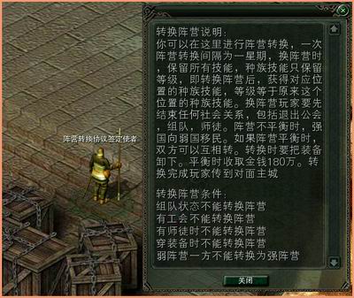 在远古遗址的“阵营转换协议签订使者”处,你可以选择进行阵营转换,一次阵营转换间隔为一星期,换阵营时,保留所有技能,种族技能只保留等级,即转换阵营后,获得对应位置的种族技能,等级等于原来这个位置的种族技能。