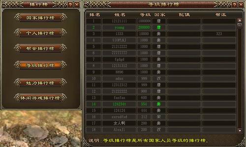 相信大家都比较想知道的便是活动时间了,小编在此偷偷的告诉大家,只要是新服开启的一周内,《天子》官方都将举办“等级龙虎榜”活动,对游戏中的等级进行排名,如有重复的等级,则按经验值来计算。