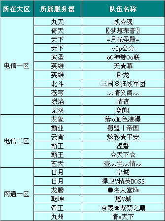 24强队用其卓越的实力赢得了首轮胜利,其中网通一区的“日月”服务器、电信一区的“天下”服务器、“英雄”服务器和电信二区的“霸王”服务器的冠亚军两支队伍更是双双携手出线!让我们看看这24支强队都是哪些队伍吧: