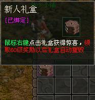 玩家右键点击新人礼包后会根据玩家的等级随机赠送和玩家等级所匹配的武器、装备一件!若玩家没有得到装备会得到宝箱一个、钥匙一只,玩家继续点“领取”将会得到随机经验或如意等道具!