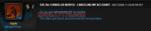 [达图尔的变形魔棒]是许多联盟玩家的玩具,可以将玩家变成一只熊怪,但巫妖王之怒测试服上,暴雪将改变身加入了某些特别的限制,联盟玩家强烈反对,并在暴雪官方论坛开贴,扬言不改回就罢玩,结果是设计师“提古勒”现身: