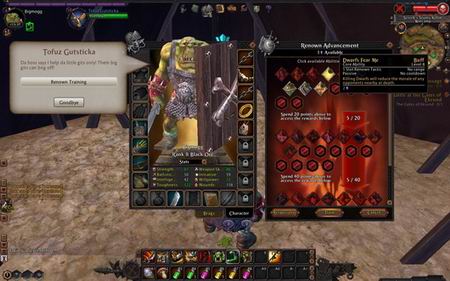 一般技能是玩家每到达特定等级就可以到训练师处花钱学习的技能,荣誉技能则是玩家在击杀敌对阵营玩家后可以提升自己的 Renown Rank,每提升一级 Renown Rank 可以获得 1 荣誉点,用荣誉点来强化你的荣誉技能,荣誉技能大多是增强玩家的被动能力,例如让玩家的某一属性获得加权、或是在对付特定种族时可以有额外伤害之类的,由于可以选择的项目很多但是点数却不够,因此玩家需谨慎的考虑要怎麽分配自己的荣誉点.