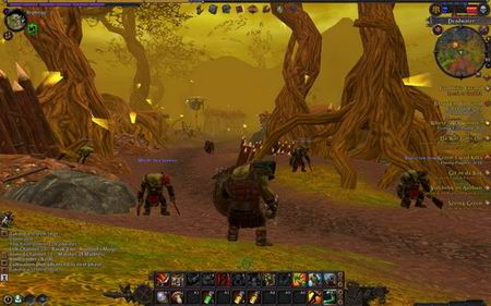 战场的运作机制是你可以随时随地的排战场而不用找特定 NPC,只要在小地图旁边的按钮点一下就可以开始排队,等到双方排队的人数足够之后就会开启战场,并将玩家传送进去,每个战场的地形跟玩法不尽相同,在争夺胜利的过程中,砍死敌对阵营玩家将可以获得 Renown Point 来提升你的 Renown Rank 以及获得一般的经验值,并且有一定的机率可以在敌人的尸体捡宝,当然这个捡宝不是从敌对玩家的包包掉的,而是像捡怪物的尸体那样,所以在《战锤》当中,要靠砍人升级也可以的。
