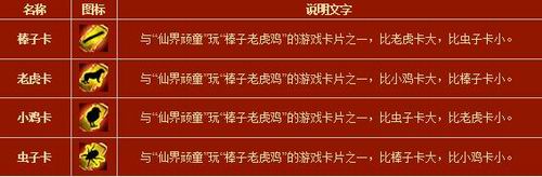 2.与仙界顽童对话,随机选择一种卡片与他竞猜,按照“棒子>老虎>鸡>虫子”的循环规则,如赢了此局,可继续进入下局竟猜,赢取的局数越多,可以获得箱子的级别越高,开出的奖励越好。
