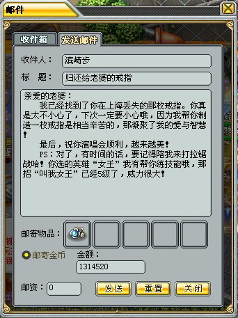 光带MM玩还不行,还得偶尔来一点点小礼物给MM一份惊喜。打开好友面版,然后很方便的与MM进行私密聊天,看看她都喜欢什么。然后去邮箱,利用《英雄岛》超方便的邮寄系统给MM送上一份惊喜。
