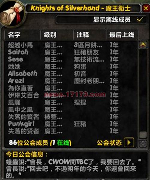 居十日:T3战士又见到TBC后的新会长,说:你的亲友团天天在外面开G团 玛胖 GLR KLZ 黑了不少金子,这样下去恐怕公会会解散。会长不搭理他。T3战士去做日常任务了。会长不高兴。