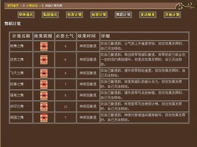 在这个新上线的项目中,《三国征战》的武将技能分成了单体强化、集团强化、伤害计策、妨害计策、舞蹈计策、复活恢复和其他计策。每种类型的技能都有详细的计策名,效果范围,以及发动计策所需的必要士气、效果时间和效果内容。