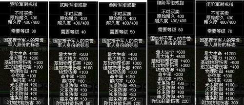 当功勋值到达一定数量时即可获得军衔戒指,戒指耐久度固定400,装备颜色为白色. 所奖励军衔戒指均为不可交易。(详细见下图)