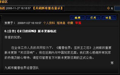 《魔兽世界(专区 视频)》的大陆运营商第九城市官方论坛今日发出公告,宣布《魔兽世界》将进行一次重要的版本更新“末日回响”。玩家纷纷猜测这是九城将开放《巫妖王之怒》的前兆,现在官方论坛已经一片欢呼雀跃。在上一个资料片《燃烧的远征》开放之前,九城也有过这样的一次重大更新,当时那个版本名为“风暴前夕”。