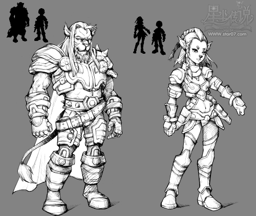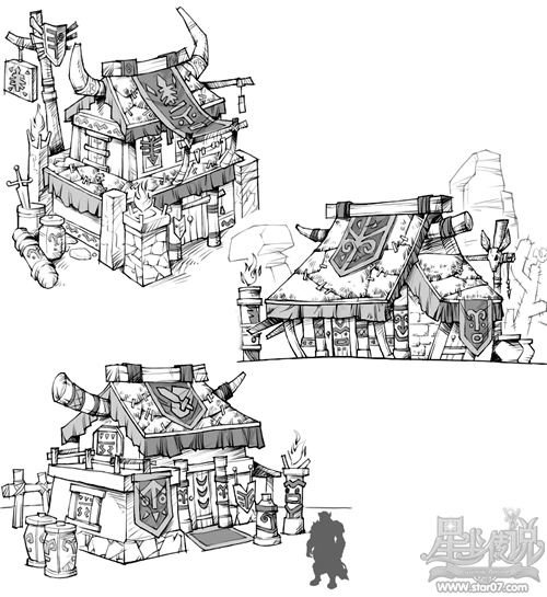 Steven.Z:这些资源是在前期美术提供的一些概念设计,包括世界概念图、人设和种族等等来帮助策划更直观的看到这个世界的雏形!例如在这里我们看到的就是游戏里兽人的人物和建筑初稿设计图。