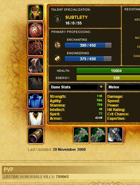 Nihilum的会长Kungen算是这个世界上最有名的《魔兽世界》玩家之一,不只如此,他还是最有钱的玩家之一,美服全新更新的英雄榜可以偷窥玩家的金钱,副本,甚至竞技场的战绩,可以说,在armory面前,任何人都没有秘密。