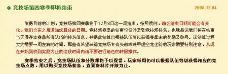 依据目前的计划,竞技场第四赛季将于12月8日这一周结束,按照惯例,确切结束日期可能会有变化,我们会在之后通知您具体的日期。竞技场赛季的结束仅仅涉及到竞技场排名,也就是说我们将在结束当天保存本赛季所有队伍的排名信息,并据此结算出哪些队伍可以获得赛季末的奖励及称号。该结算过程大约需要一周左右的时间。那些有希望获得竞技场专有头衔或铁甲虚空龙坐骑的玩家需要特别注意,从现在开始到收到奖励为止的这段时间内请不要进行角色的转服操作。