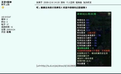 原来,在大校阶段,玩家完成任务后获得的战骑不再是统一的属性,而是分白、蓝、黄、绿、紫五种颜色,颜色越高级的摩托属性越好。这位论坛ID为“圣堂V雷神”的玩家发帖展示的,正是绿色品质幻影战骑,这也是至今玩家公开展示过的品质最高的大校摩托。