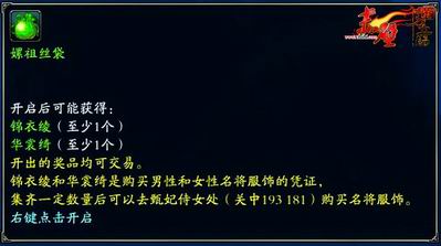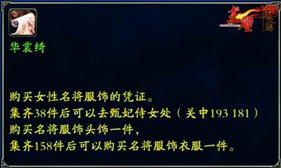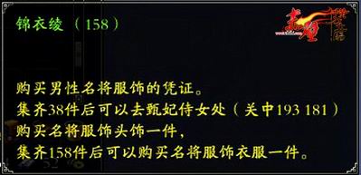 想要购买名将服饰,玩家首先要拥有螺祖丝袋,打开之后,即会开出数量不等的锦衣绫或者华裳绮。锦衣绫和华裳绮可是购买名将服饰的凭证哦,其中锦衣绫用于购买男装,华裳绮用于购买女装,当玩家集齐一定数量后便可以去关中长安城“甄妃侍女小瑶”处购买名将服饰了。购买的这些名将服饰可以对其进行附加符玉,让玩家化身名将之余,拥有更强大的属性哦!