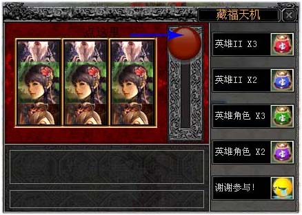 在《英雄2》的真实武侠大陆上,玩家每天都在为梦想而奋斗拼杀,为自己的扬名立万而辛苦奔波,难免会觉得有些许麻木,在这低潮之时,忽见天空仙女下凡,身边乾坤袋满满的,降落在天龙城,江湖就此展开藏福天机的抽奖活动!此次藏福天机倾情推出,让玩家在忙碌中能够轻松得到宝物,享受幸运带来的惊喜!