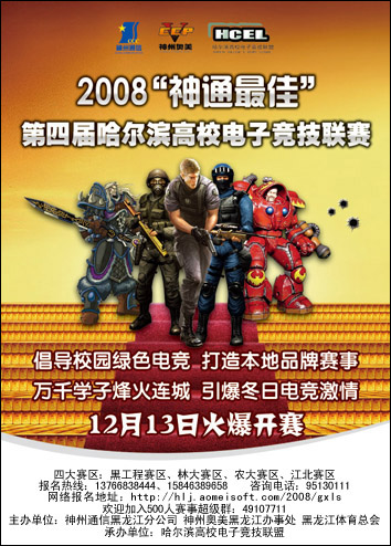 神州通信黑龙江分公司与黑龙江体育总会、哈尔滨高校电子竞技协会为促进整个黑龙江地区电子竞技的市场培育与人才培养,一同携手宣传和推动电子竞技品牌赛事----“神通最佳战队”。本期神通最佳战队以高校在校学生为主,以倡导校园绿色竞技、打造本地品牌赛事为为赛事主线。神通最佳战队在成为本地品牌赛事的同时,更要肩负起本地电子竞技健康持续发展的重任。同时,神通最佳战队大赛还将实现为哈尔滨第24届世界大学生冬季运会造势的预热效果,通过本次赛事可向世界各地的大学生展现哈尔滨72多万大学生的激情四射与活力。