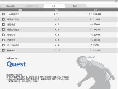 基本的管理我们都大致弄清楚了,那么让我们继续了解下任务等更多的内容吧。游戏里边一共有“个人联赛任务”“球队成长任务”“连胜任务”“球员成长任务”“难度任务”“进球任务”“多人对战任务”及“杯赛任务” 8大类型79个任务。每当玩家达成一个任务条件不但可以获得一定的金币奖励还能够获得一个标志,这个标志能够作为球队的头像显示出来,想想吧,如果您能够完成“所有挑战杯冠军”或者“联赛30连胜”之类特牛的任务并将其图标挂起来,那是多么荣耀的事情。
