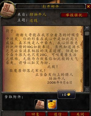 一位玩家如此形容这个故事:当初看见着新人之时,在到处找人借钱,他就顺手丢给他10G,早就忘了此时,不想许久之后,这位玩家回信还钱。