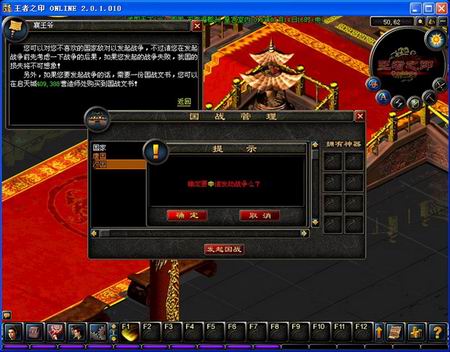 在《王者之印》中,国家一旦发起国战或受到挑战,都会在国家公告中,以醒目的字体广而告之,包括发起国、接受国、国战时间等信息统统一目了然,臣民们不光能及时获知自己国家最新的国战动向,更可以充分利用时间做好备战准备。在国战时间内,交战国成员通过启天城的“国战传送员”,可以到达国家战场,参与到如火如荼的国家激战中来。