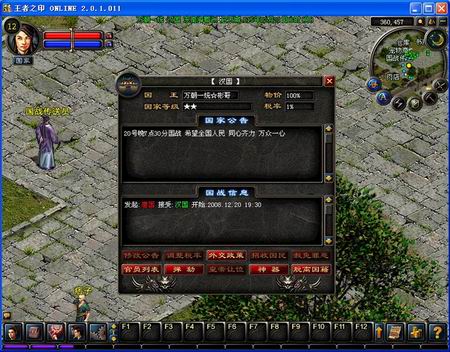 在《王者之印》中,国家一旦发起国战或受到挑战,都会在国家公告中,以醒目的字体广而告之,包括发起国、接受国、国战时间等信息统统一目了然,臣民们不光能及时获知自己国家最新的国战动向,更可以充分利用时间做好备战准备。在国战时间内,交战国成员通过启天城的“国战传送员”,可以到达国家战场,参与到如火如荼的国家激战中来。