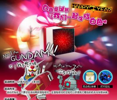 《SD敢达online》(高达)除了“白色圣诞节让我们一起涂成白色”活动外,还有许多精彩的圣诞新年活动会陆续登场,尽情期待!