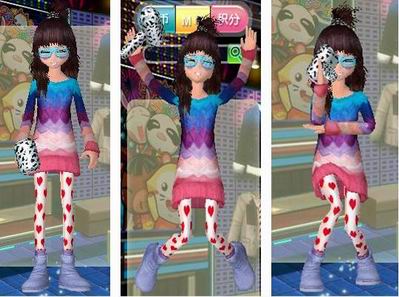 在微卷的长发上扎个小羊角,让可爱的美眉们更添童趣,让你的可爱更加惹人怜爱!蓝色的眼镜,一件宽松的五彩针织毛衣,在色彩的和谐搭配下,显得你娇小可爱!一件爱心紧身裤裤更能衬托出腿部的完美线条,配上紫色的街头短靴,五彩的个性搭配,完美诠释可爱定义!配上时尚的牛牛小锤,完美出击,引领时尚!个性的舞姿更显美眉们的可爱动人,为这个冬天带来欢乐的热度!