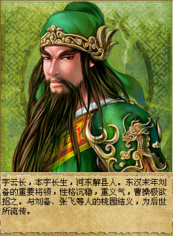 关云长的故事流传千古!多少年来,关羽的种种都被人传诵。他的义薄云天,他的文韬武略,甚至他的孤傲冷峻,都让后人痴迷,他是三国唯一一个与“文圣”孔子齐名的人,被世人称之为“武圣”! 桃园三结义,千里走单骑,刮骨疗伤,败走麦城,过五关斩六将,温酒斩华雄,大意失荆州,水淹七军,斩颜良文丑,大战黄忠,单刀赴会……他的故事太多了,不用多说,相信《三国鼎立》中所有玩家都不希望与关二哥为敌的!