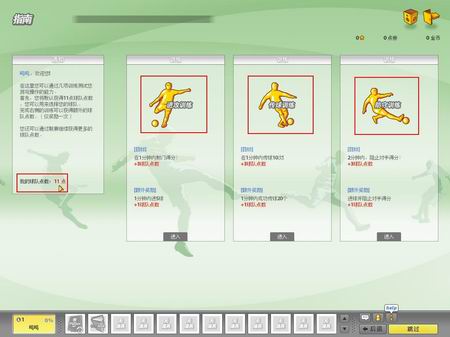 当您首次登陆游戏并创建完游戏角色后,将进入到新手指南的任务模式。您如果完美的完成新手指南的全部内容,那将意味着您在游戏初期就拥有足够的“球队点数”选择心仪的球队。新手指南任务分为3个部分,进攻,传球和防守。每项任务拥有3点基础球队点数和1个额外奖励点数。加上登录后您默认拥有的11个球队点数,在新手指南完成之后,最多可拥有23个球队点数。