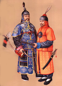 清朝一般的盔帽,无论是用铁或用皮革制品,都在表面髹漆。盔帽前后左右各有一梁,额前正中突出一块遮眉,其上有舞擎及覆碗,碗上有形似酒盅的盔盘,盔盘中间竖有一根插缨枪、雕翎或獭尾用的铁或铜管。后垂石青等色的丝绸护领,护颈及护耳,上绣有纹样,并缀以铜或铁泡钉。铠甲分甲衣和围裳。甲衣肩上装有护肩,护肩下有护腋;另在胸前和背后各佩一块金属的护心镜,镜下前襟的接缝处另佩一块梯形护腹,名叫“ 前挡”。腰间左侧佩“左挡”,右侧不佩挡,留作佩弓箭囊等用。围裳分为左、右两幅,穿时用带系于腰间。在两幅围裳之间正中处,覆有质料相同的虎头蔽膝。清代八旗兵的甲胄,用皮革制成,此服供大**时穿用,平时收藏起来。