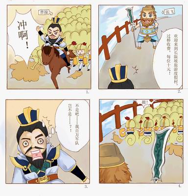 幽默的将长坂坡定义为度假村,并将对路过人收取所谓的“过桥费”,这才吓得曹操勒马停住,又策马打道回府。因为……百万军队的过桥费那可是天文数字。宣传团巧妙的将部分三国史融入四格,具有一半真实性,一半幽默性。在了解长板桥的大致胜负外,加入了简单易记的风趣内容。