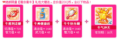 “属你最牛”礼包里包括牛妞利是糖、牛帅健康浴、牛牛快乐刷、牛气冲天等绝版物品,总属性超过140喔!
