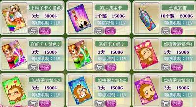 普通礼堂房主卡、手上粒子卡(黄色)、踩人房主卡、动态房主卡、变色房主卡炫色彩带、彩虹卡(绿)、彩虹卡(紫色)、悠嘻猴表情包1、悠嘻猴表情包2悠嘻猴表情包3、悠嘻猴表情包4、自动加血卡、家族扩充卡(中型)、生日卡招呼、寒冷、拍拍、清新月色、金色星球、信纸