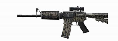 焕彩M4:使用30发5.56mm装弹的突击步枪,是世界名枪M4A1的改良型,不仅在外观上使用迷彩炫色进行装饰,使其在泥地战使用时易于伪装,而且还装置了瞄准镜,将M4精准的特点发挥到了极致。
