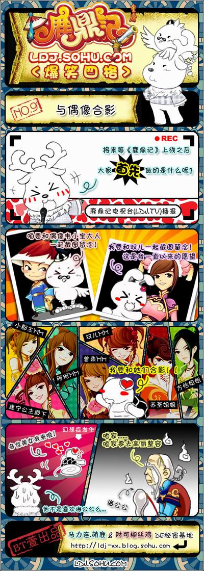 立春刚过,新学期即将来临,网游《鹿鼎记》的明星组合“鹿顶鸡”在与长假综合症进行了激烈搏斗后,终于重新振作回到工作岗位。丝鸡和萌鹿开工大吉,立即在《鹿鼎记》的新老粉丝群中引起强烈骚动,大家都期盼这两位八卦大王能早日爆出有关《鹿鼎记》新年新气象的猛料!趁着众人情绪高涨,自称读过100遍《鹿鼎记》的丝鸡,决定立即主持一场《鹿鼎记》知识问答表演赛,树立自己知识渊博的形象,谁知萌鹿提出的一系列BT问题,当场让丝鸡大囧特囧,怒火中烧!欲知详情,请看“鹿顶鸡”爆笑四格漫画第十集-有问必答!