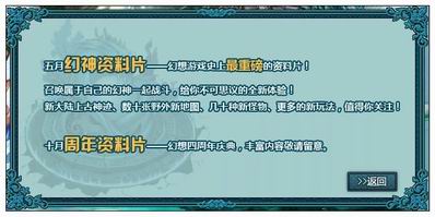 两大资料篇——包括了重量级的最新最炫的幻神!幻神到底是什么呢??幻神是一个人形的东东,似一个幻灵依附于人类,协助人类战斗,但同时他们有着自己的性格、技能、等级、经验、天赋等等。如果战斗时携带了幻神,就像增加了一个队友进行战斗,且幻神杀死的敌人经验和掉落物品都属于你哦。;幻神版本将在09年5月随新大陆、新野外地图、新怪物一起推出呢,绝对是不能错过的;并且10月的自由幻想4周年活动也是超级火爆的,至于有哪里活动呢,小记也很想知道呢,让我们一起期待吧^^