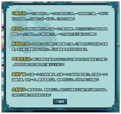 六大新系统——包括上文的幻神、新大陆、新等级上限,PK竟技系统、家族扩展、全新副本;想必大家看到这些字眼,就已经热血沸腾了吧?除了羽族大陆之外呢。又将推出神族大陆,真的让人有很大的遐想空间额,新等级又将会提高到多少级呢?众玩家期待以久的PK系统也将随着新版本诞生。全新副本将在09年登陆噢,玩家们敬请期待。