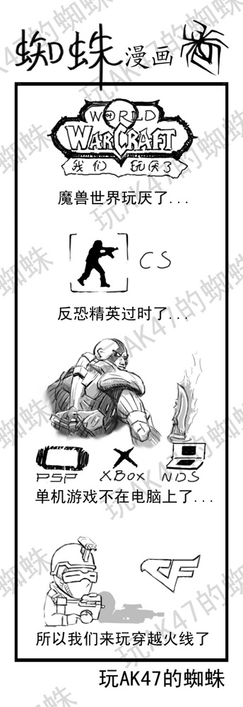 “幽灵地带”FLASH的制作着重体现了“幽灵”也疯狂的游戏境界,以幽默诙谐的动画制作表现出幽灵的机智与勇敢,配以惊心动魄的背景音乐,更是让玩家体会出游戏中的紧张气氛,当然在CF的世界里也许还隐藏着许多像“玩AK47的蜘蛛”一样的高手,只是还没被我们发现,在此笔者也希望有更多的玩家能参与到CF之中,以自己独特的形式来表达对CF的热爱并从中体会到乐趣,也衷心的希望蜘蛛漫画能出更多更有趣的经典制作。