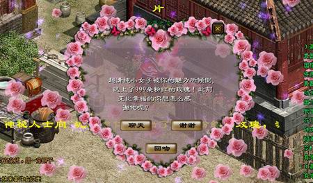 此外,如果有人送美眉999朵玫瑰花,就会天降花雨,屏幕滚动不停播放……送花的和被送的,都以浪漫闻名《征途》了!其实不管用哪种方法出名,游戏只是娱乐,放松心情就能找到快乐,最后祝你们的大名常上“电视”,做《征途》知名人士!