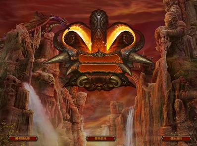登录界面较为华丽,红黄色的背景,褐色的山崖上两尊巨石神像,手持利刃遥遥对视。屏幕的左上方有一只巨龙盘旋,不时吞吐烈火,遥望还能看到两只飞龙在天空中飞舞。这个登录界面十分华丽,帐号输入处,鼠标滑过时会隐现出闪光灯图腾。整个登录界面动静结合,气氛营造的还可以。