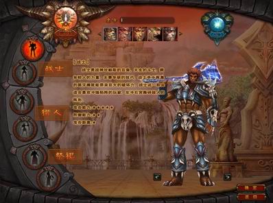 人物选择界面,笔者认为,这界面是整个游戏的亮点,左边为选择兽族,右边为人族。又各分近程,远程和法术3个职业,兽族为战士、祭祀和猎人,整个兽族的人物设计孔武有力,豪迈粗放。