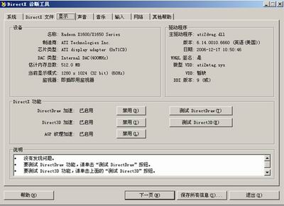 2.在“显示”页,将”DirectDraw加速”与”Driect3D加速”、”AGP纹理加速”全部启用,详见下图: