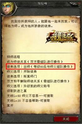 初次踏入《神鬼传奇》的世界,一切都是那么新奇。对于一个新人来说,享受探索的乐趣,固然是一件很快乐的事,但是也难免会遇到一些自己解决不了的问题需要帮助和指引。因此,只要玩家等级10级且小于60级,便可找一名60级以上已经拥有师傅资格及【一级师傅】称号的玩家拜他为师。当拜得师父之后,探险的旅途中,就不会再感到寂寞和无助了。