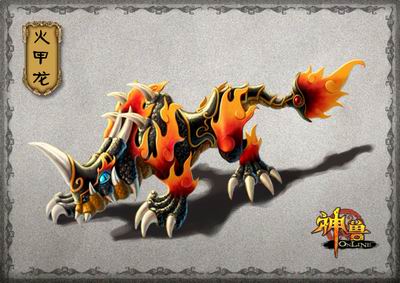 神兽“火甲龙”:身披金鳞碧甲,头部与龙惊似,走动时尾部如火焰跳跃,敏捷如风,攻击凶狠。火甲龙在《神兽》世界中以速度见长,攻击对手于转瞬之间,所以可大大提高角色的敏捷和力量,同时可以提高角色的闪避率。对于敏捷要求较高的箭神和武圣,是必不可少的伙伴!