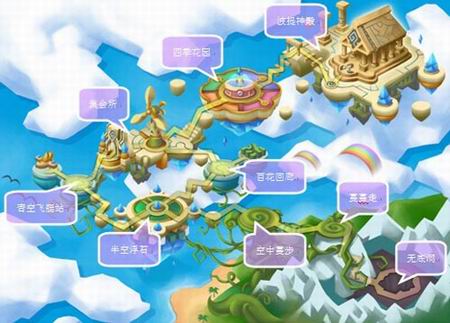 由于不明原因,天空之城停泊在永夜城的上空,还垂吊了巨大藤蔓编织成的绳索下来,连接天空之城与伊甸园大陆陆地。天空一直是天使们向往居住和冒险的天堂,在藤蔓交错编织的空中蔓步,在半空中的浮石平台玩闹嬉戏,在空中花园百花回廊欣赏美景。但在天空之城的终点——波提神殿却深藏着巨大的暗影之迷,最后的决战副本等待天使们来挑战!