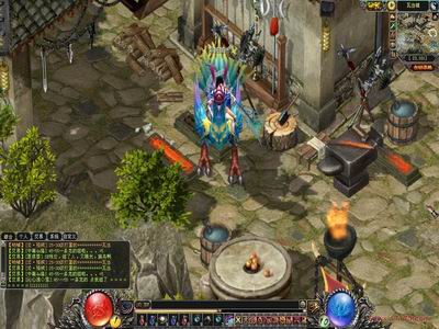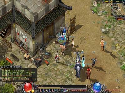 因为游戏尽可能降低了电脑配置需求程度,因此即使在机器性能比较好的情况下看到的游戏画面并不是非常完美,但也有其独特之处。温和色彩的游戏场景和艳丽色彩人物形象形成了鲜明的对比,突出了以玩家为主体的理念。下面让我们针对部分游戏截图详细解说: 初入《刀剑英雄Ⅱ》大家立刻会看到一个熟悉的身影——赵天师。这个大慈善家率领两大爱心使者分三角形接待瓦当镇新手玩家。这里是考验玩家的第一道槛,我们看到赵天师本次位置非常不凑巧被玩家拥堵到了台阶之上,导致大批玩家进退不得,当然走不过去,我们可以用轻功跳过去,让别人看内裤,我们走自己的路……赵天师落入凡间身前鹤后均有异象,巨大的石块挣扎扭曲变成一只只狰狞的斑斓猛虎,动感十足。场景与人物似乎并不是在同一个光源照射之下,人物有时没有阴影,有阴影的同时和场景不搭配,这是个非常小的失误,估计在下一个版本中会得到解决。 狂风其实很内秀,连忙找个人少的地方看看游戏画面风格。这里是铁匠的地盘,通过这个小场景,我们可以发现《刀剑英雄Ⅱ》的美工设计能力相当强大,小小铁匠铺也做的如此精致,各种物件丰富,而且很注重细节处理,比如半掩木门上的铜环,墙上小灯等等。包括周围景色搭配也给人带来了舒适的美感。不过这里狂风挑个茬,似乎很多出现岩石的地方,岩石质感还不够突出,另外游戏中房屋的样式没有独特的风格,很难说清这里究竟归属到中国哪种地方的民居风格。如果和《天下贰》中的圈楼,或者《丝路传说》中的房宇相比较,就缺少了能使中国玩家潜意识获得认同感的机会,这样的铁匠铺完全可以克隆到任何武侠类游戏当中,那么玩家或许心底会产生出玩《刀剑英雄Ⅱ》和玩其他的什么游戏是一样的想法。