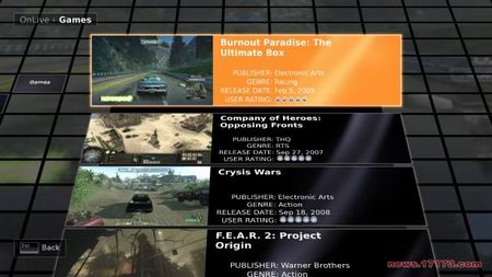 Onlive得到了视频游戏厂商的青睐,目前该平台提供16款游戏,其中不乏《Crysis》、《英雄连》、《FEAR2》这样的大作,待今年年底正式发布时还会有更多加入。