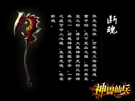 断魂,取天地元铁,万年地火熔炼而成,重千钧。天下至凶之器,断六界至坚之物。昔日大魔神蚩尤的三件神兵之一,后魔神镶龙眼于斧,一斧之威可夺人心魄,生裂龙魂,故名断魂。