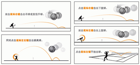 c)决定击发球的类型——鼠标左右键配合击出“平抽、上旋球、下旋球、挑高球、削球”等多种球路。