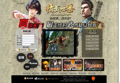 登陆引导页后,视频窗口自动为玩家呈现出犹如电影大片般的清晰和精彩。首先展现了南派武术风格的飞鸿武馆、繁华的南京路商业街,还有如诗如画的普陀山莲花池这三大场景,之后泰拳、柔道、太极拳、八极拳、跆拳道和迷踪拳这六大流派眼花缭乱的激烈对打把视频推向高潮。让玩家还没有正式进入官方网站就犹如身临其境感受到了《精武世界》的真实与震撼!