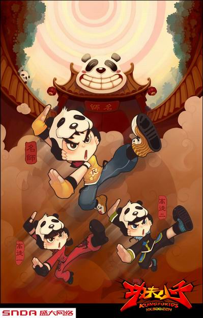 中国风永远是当前流行的元素,可爱的熊猫头套,实力高超的名师带着徒弟们在传授其漂亮的回旋踢。